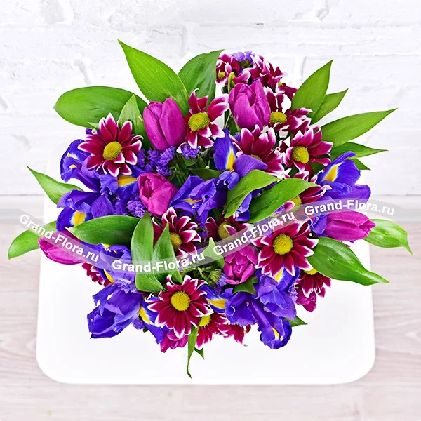 Стандартный: тюльпан фиолетовый - 8 шт., ирис синий - 8 шт., хризантема кустовая ромашковая бардовая - 3 шт., декоративная зелень, статица, оазис, коробка.